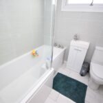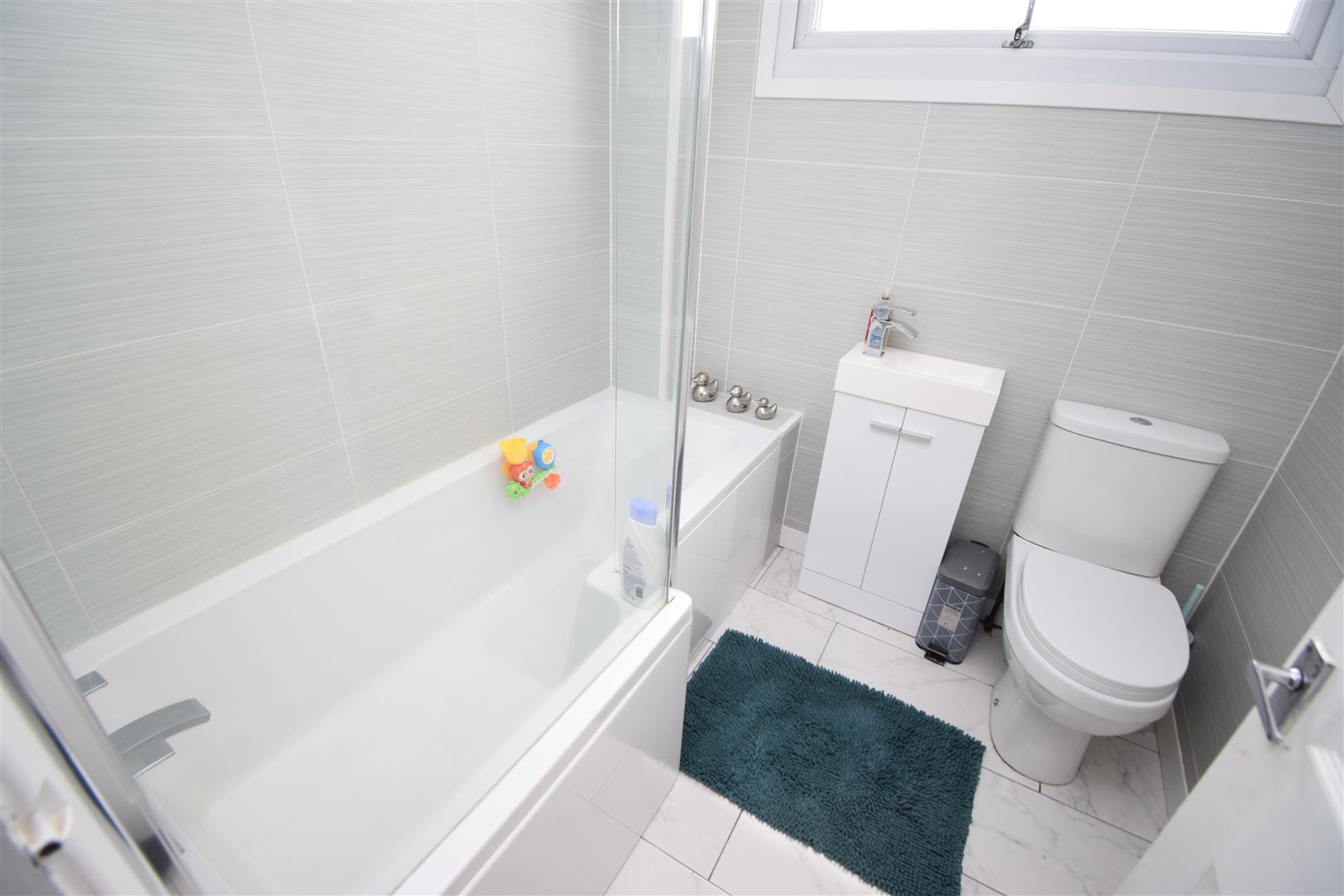 Has white suite comprising: shower bath with glass shower screen and mains shower, vanity unit with built in handwash basin, WC, tiled walls and tiled floor and central heating towel radiator.