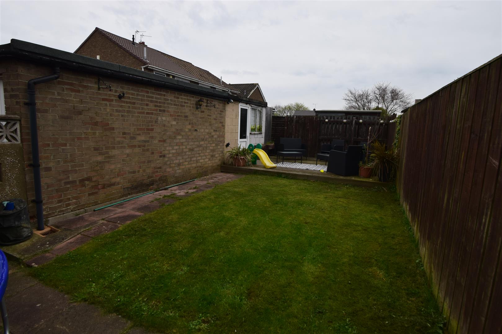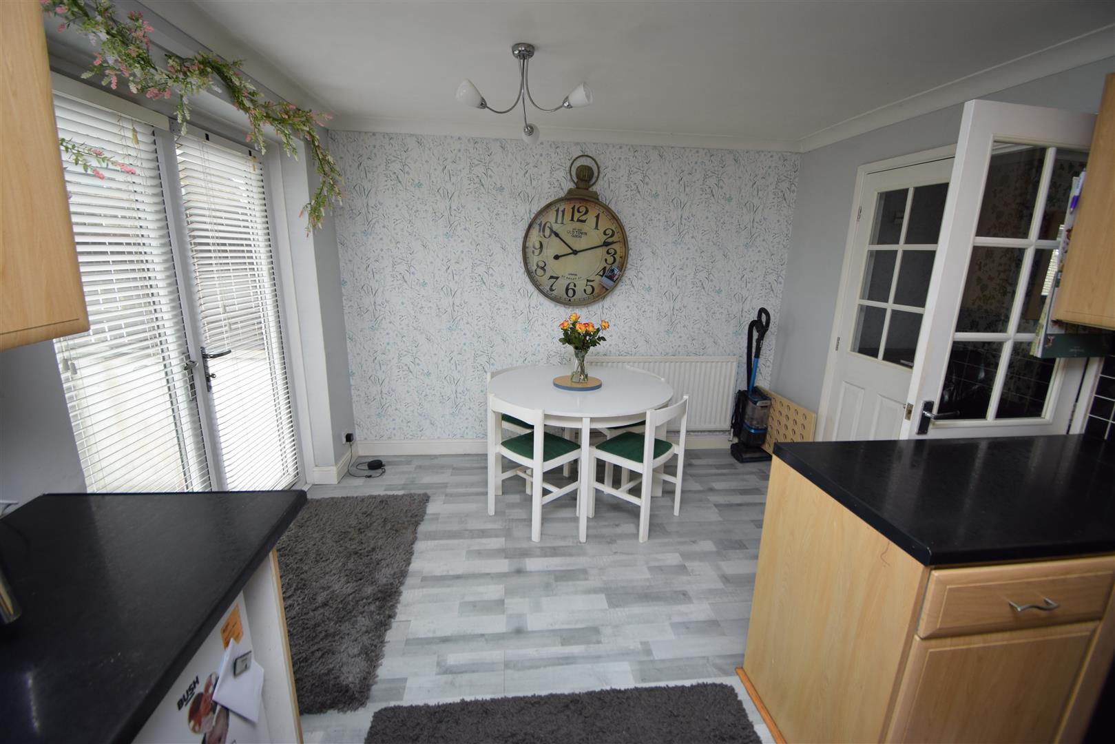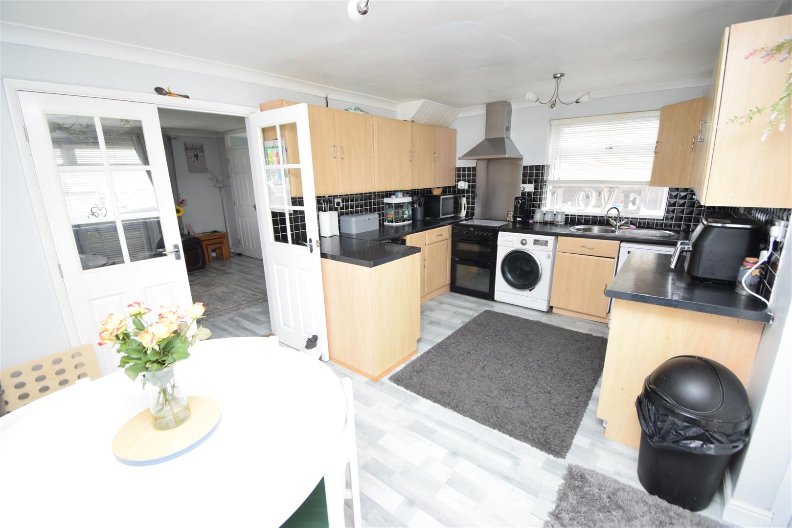Has a range of fitted wall and base units, laminate work surfaces, inset stainless steel sink unit with mixer tap, tiled splash backs, stainless steel extractor canopy and splash back, plumbing for automatic washing machine, coved ceiling, laminate flooring, central heating radiator and UPVC French doors leading out onto rear garden.