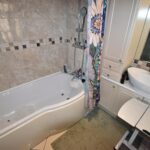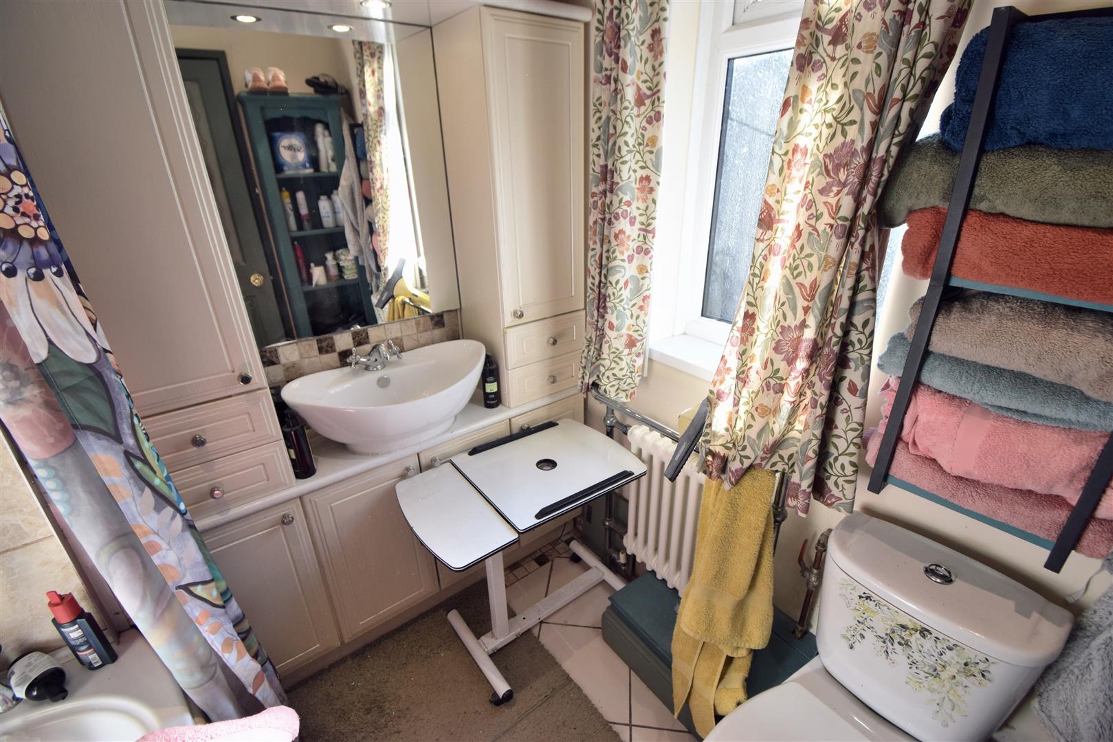 Has white suite comprising: shower bath with mixer shower over, vanity unit with built in hand wash basin, WC, tiled floor and contemporary central heating radiator.