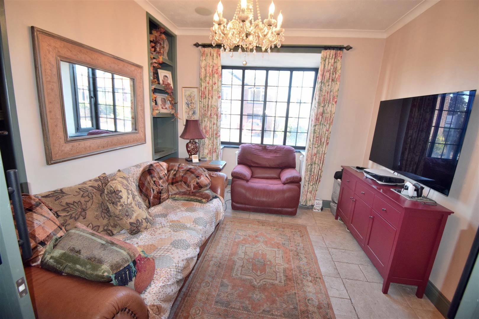 Has tiled floor, feature log burning stove, built in alcove storage cupboards and shelving and UPVC patio doors leading to rear conservatory.