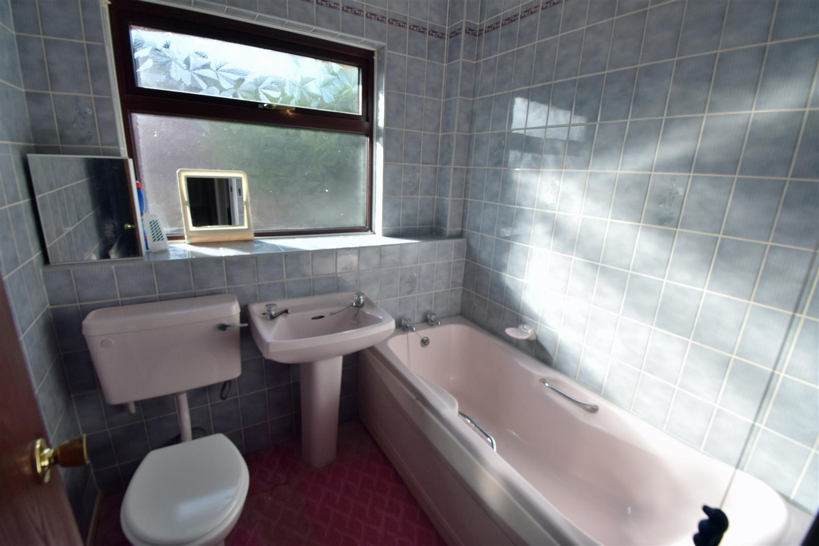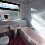 Has pink coloured suite comprising: panel bath, Hand wash basin, WC, tiled walls and central heating radiator.