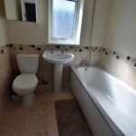Has modern suite comprising paneled bath,pedestal wash basin, WC part tiled walls and heated chrome towel rail.