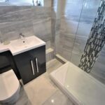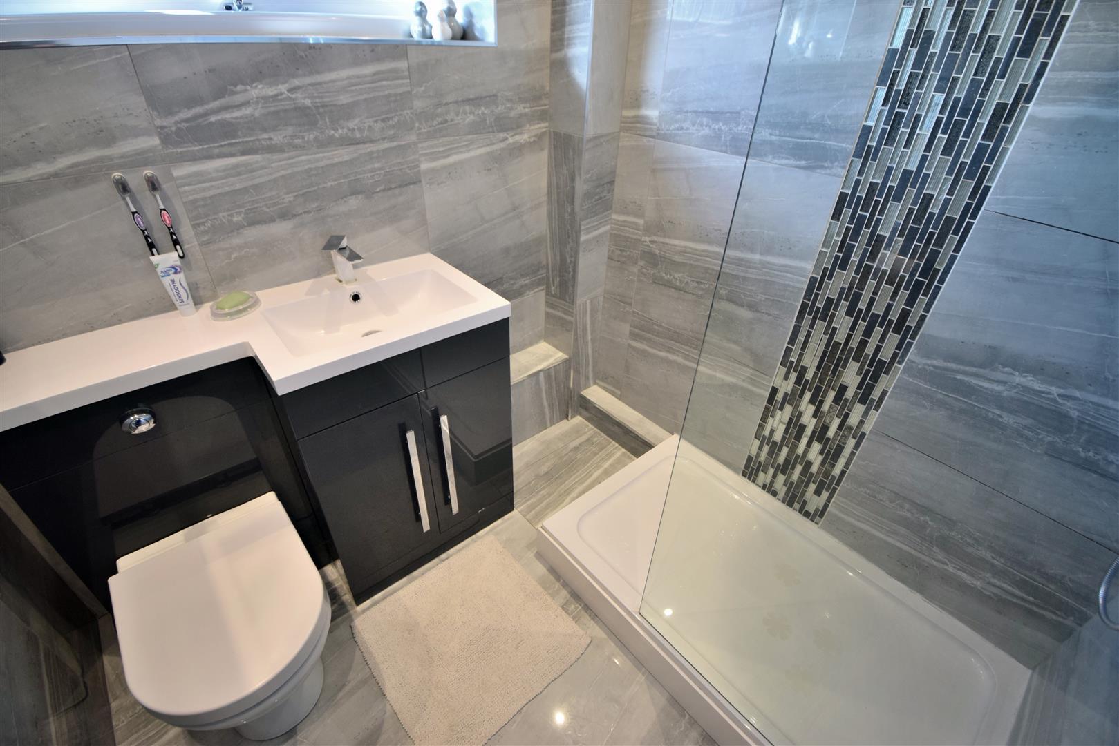 Has modern white suite comprising: shower cubicle with mixer rainfall shower, integrated hand wash basin and WC, tiled walls, tiled floor and heated towel rail.