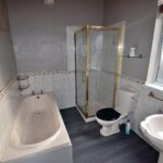 Has suite comprising panelled bath, wash basin, WC, seperate shower cubicle with electric shower, central heating radiator and cupboard housing wall mounted gas boiler.