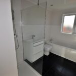 Has white suite comprising: panel bath, hand wash basin, WC, part tiled walls, central heating radiator, shower cubicle with mains shower and glass shower screen and heated towel radiator.