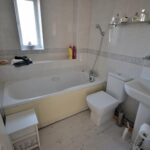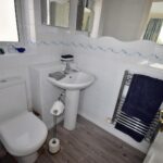 Has white suite comprising WC, wash basin, tiled walls and heated towel rail.
