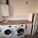 Has laminate work surface , plumbing for auto washer and tumble drier, base units and wall mounted gas boiler. UPVC entrance door and access to garage.