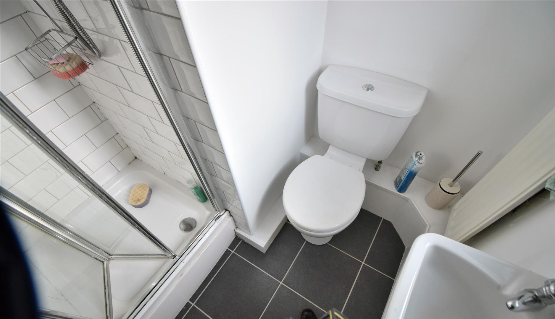 Has white suite comprising: WC, hand wash basin, single shower cubicle with mains shower, tiled floor and central heating radiator.