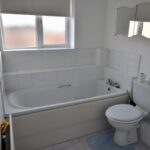 Has white suite comprising: panel bath, hand wash basin, WC, storage cupboard, part tiled walls, tiled floor and central heating radiator.