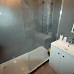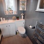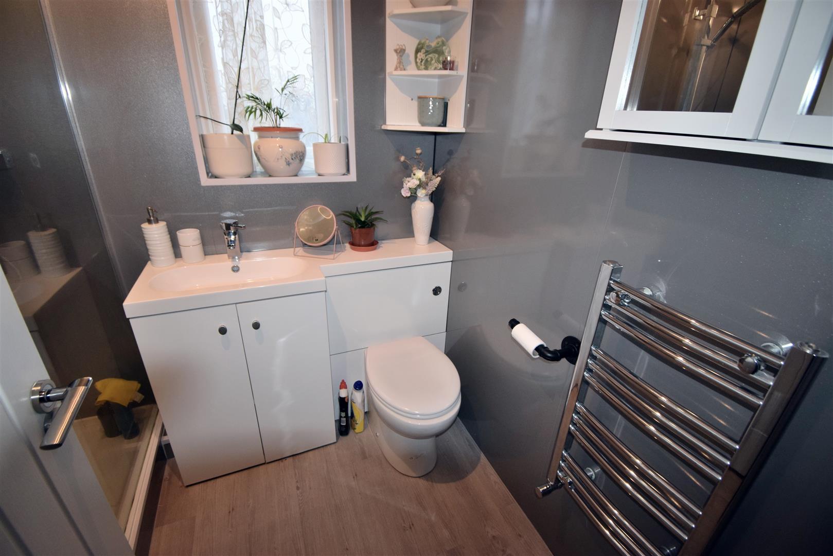 Has white suite comprising: double shower cubicle with glass shower screen, integrated vanity unit with WC and handwash basin, PVC wall panels, central heating towel radiator and laminate flooring.