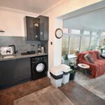 Has a range of high gloss fitted wall and base units, laminate work surfaces and splash backs, built in electric oven and hob with extractor unit and glass splashback, plumbing for automatic washing machine, laminate flooring and coved ceiling.