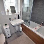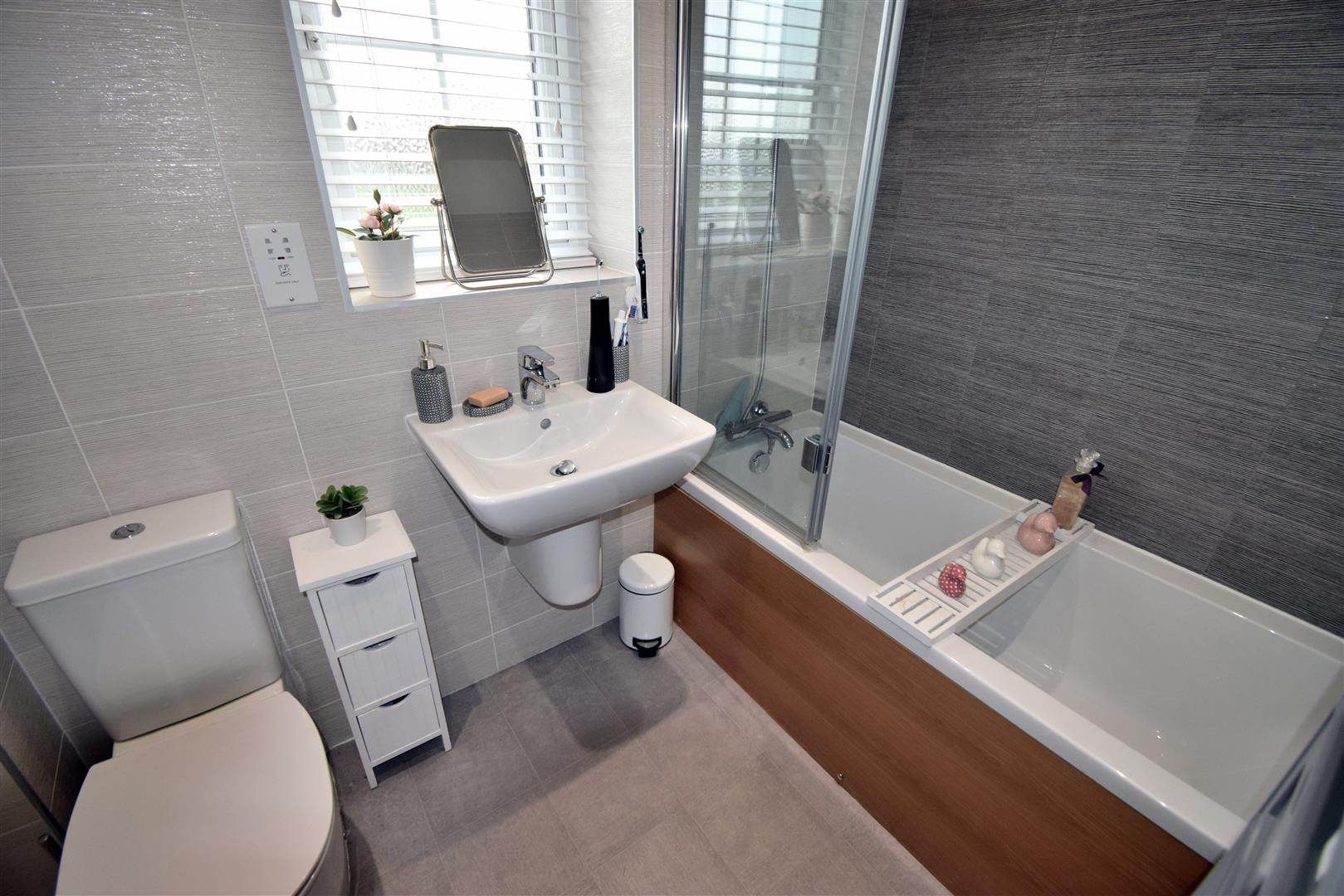 Has white suite comprising: panel bath with mixer shower, glass shower screen, hand wash basin, WC, tiled walls and tiled floor and chrome central heating towel radiator.