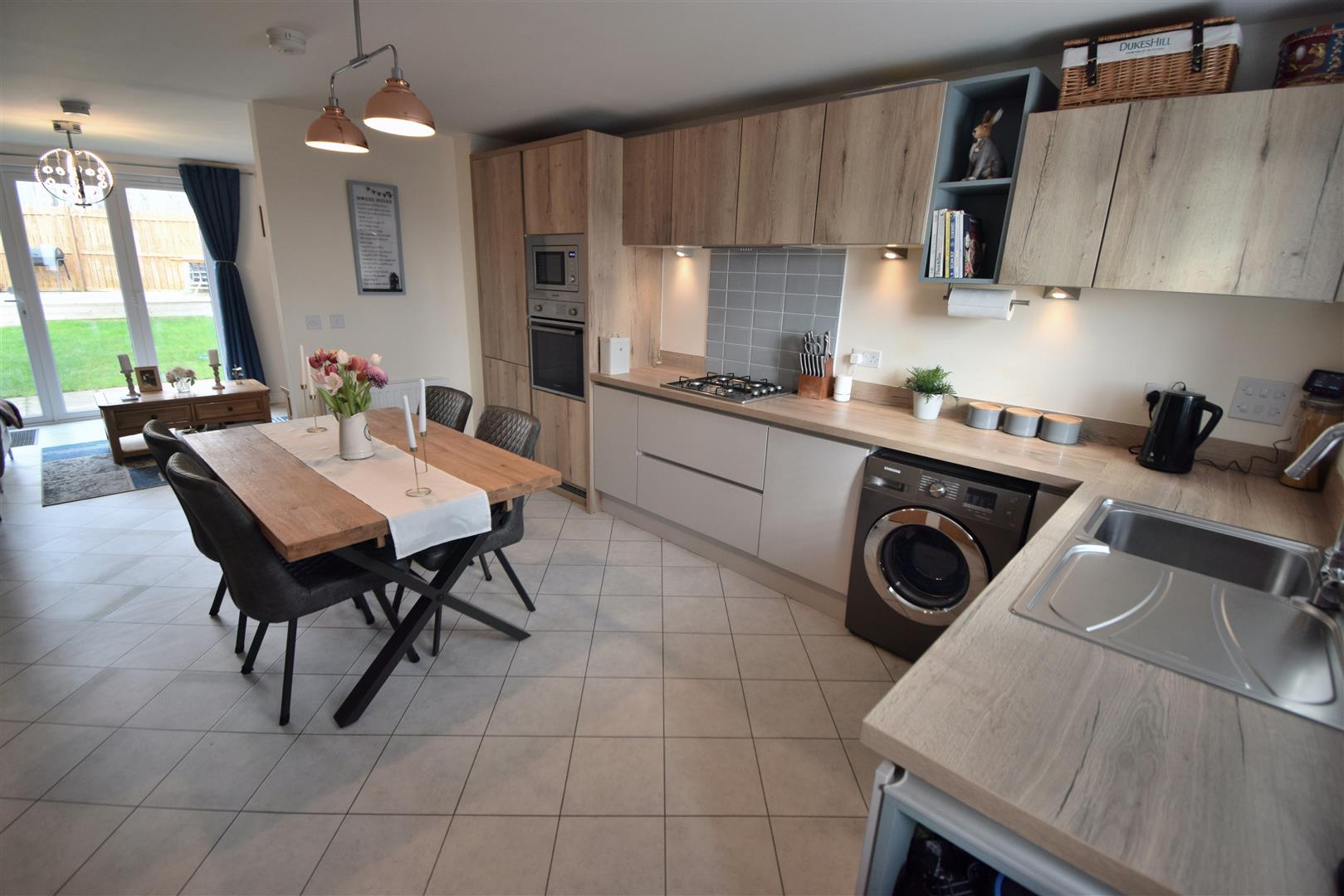 Has a premium range of fitted wall and base units, laminate work surfaces with upstands, inset stainless steel sink unit with mixer tap, integrated fridge freezer and dishwasher, plumbing for automatic washing machine, built in electric oven with gas hob, built in microwave, tiled floor, central heating radiator, staircase leading to the first floor.