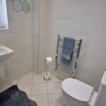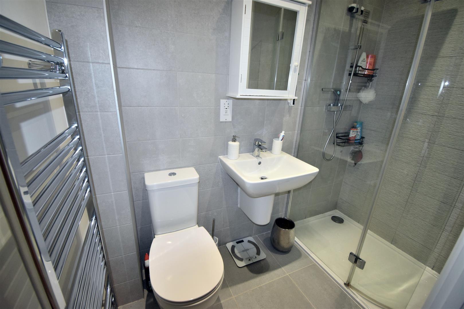 Has white suite comprising: WC, hand wash basin and shower cubicle with mixer shower and glass shower screen, tiled walls and tiled floor and chrome central heating radiator.