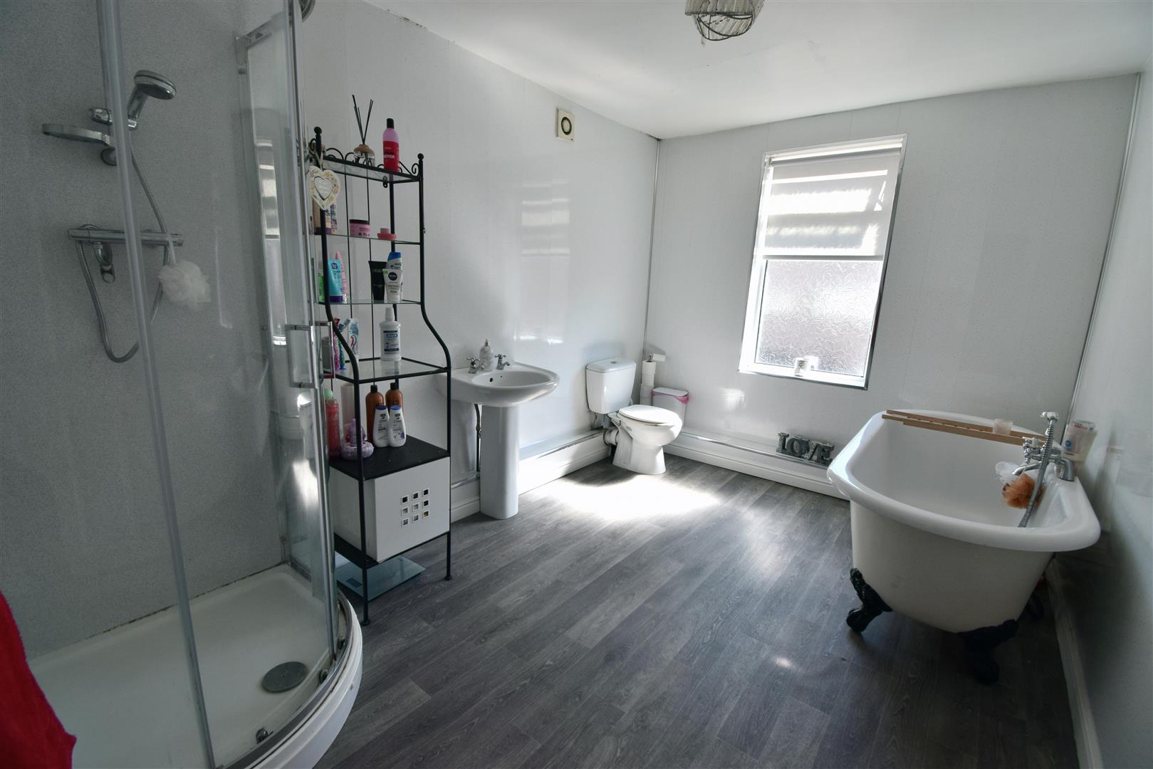 Has white suite comprising: roll top bath, hand wash basin, WC corner shower cubicle with mixer shower, laminate flooring and central heating radiator.