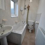 Has white suite comprising; panelled bath with electric shower over and folding shower screen, hand wash basin, WC, part tiled walls and central heating radiator.