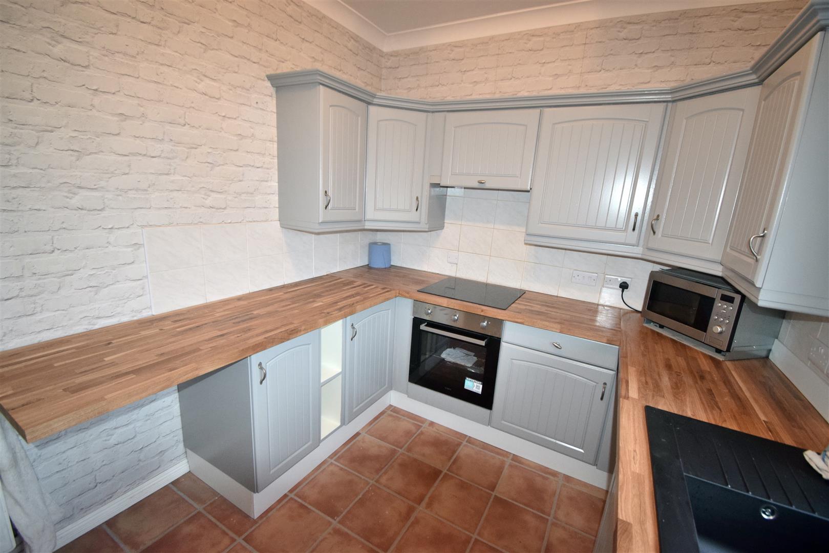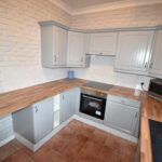 With attractive range of fitted base and wall units, solid wood work surfaces, inset sink unit, integrated electric oven and hob part tiled walls, plumbing for automatic washing machine and coved ceiling.