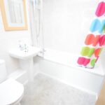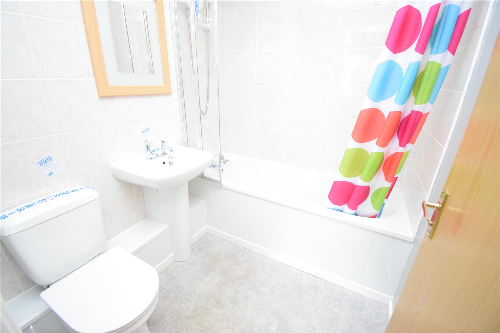 Has white suite comprising panelled bath with electric shower over, pedestal wash basin and WC, central heating radiator.