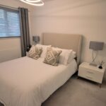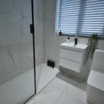 Has modern white suite comprising: WC, vanity unit with inset sink, shower cubicle with mixer shower and glass shower screen, tiled walls and floor and heated towel radiator.