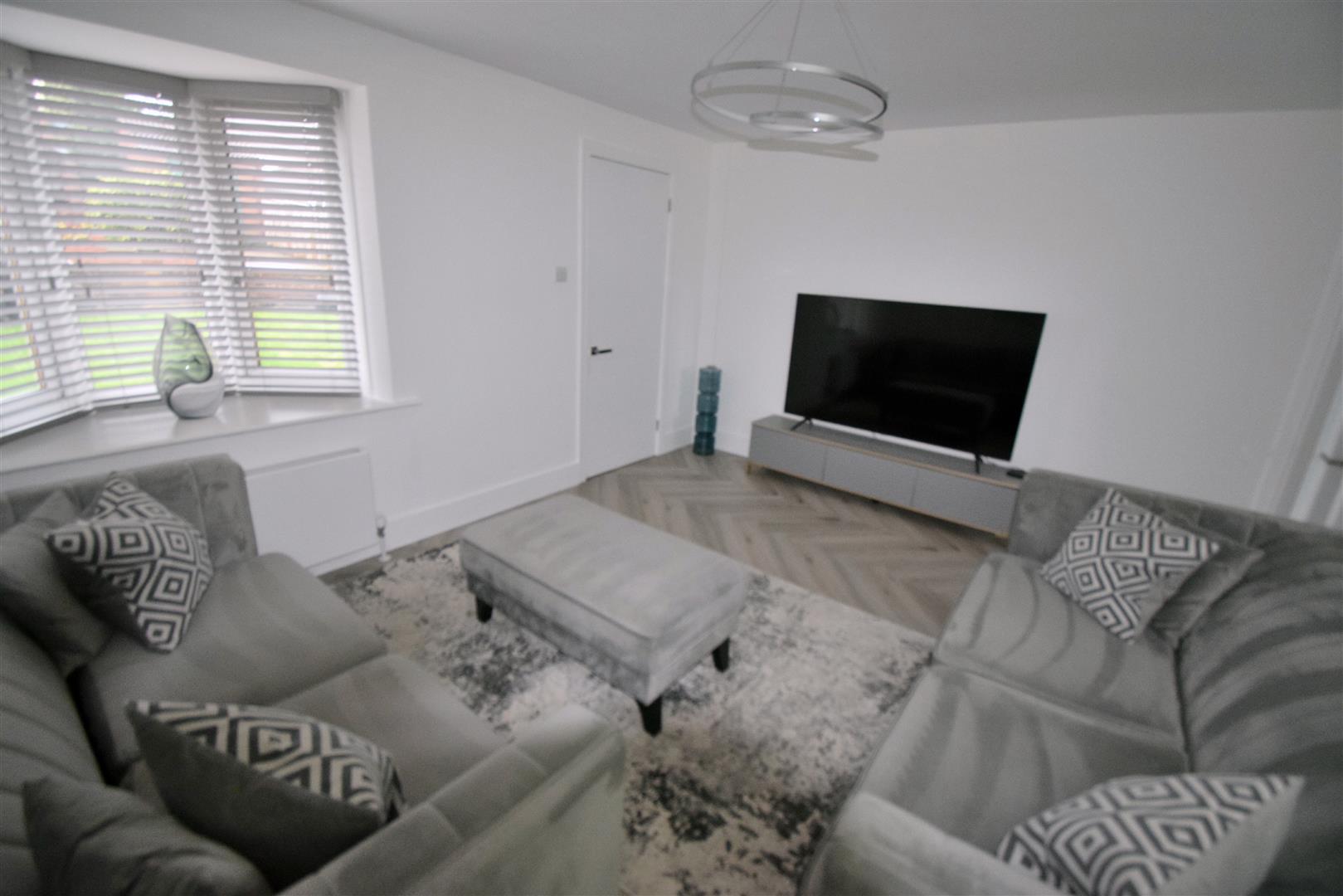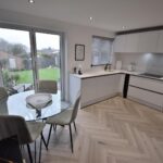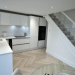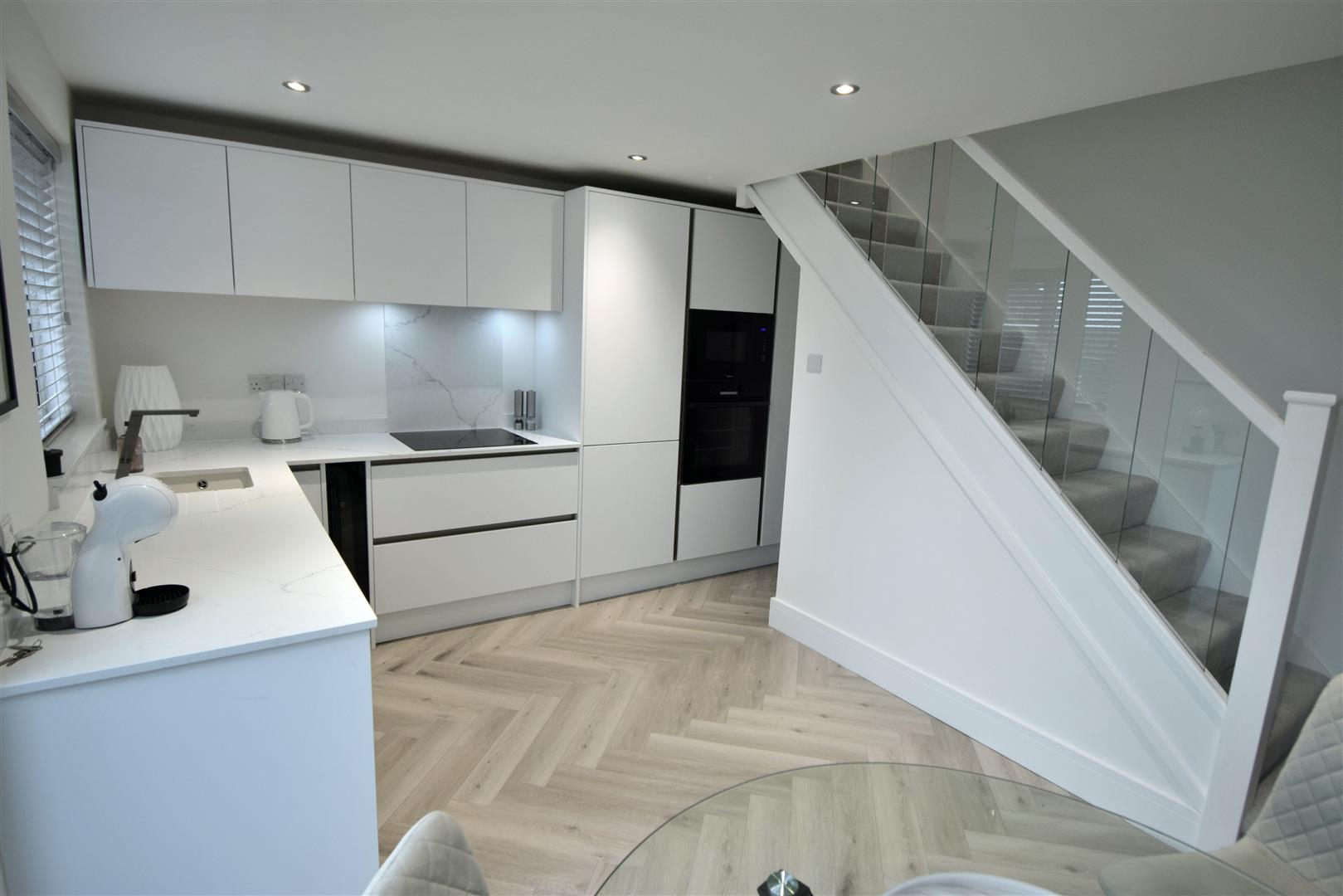 Has a superb range of high gloss fitted wall and base units, laminate work surfaces and upstands, compact undermount sink with mixer tap, built in double electric oven with induction hob, dishwasher, wine cooler, concealed washing machine, laminate flooring, contemporary vertical central heating radiator, feature glass panelled staircase leading to the first floor and UPVC bi-folding doors leading outside to rear garden.